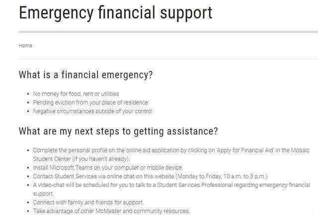 麦克马斯特大学(McMaster University)暂时没有设立专门的Covid19紧急助学金页面,但学校本身就有紧急救助金系统,有需要的同学可以尝试申请一下。