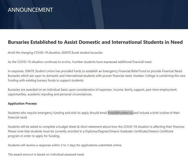 信息页面:https://humber.ca/staff/announcement/bursaries-established-assist-domestic-and-international-students-need