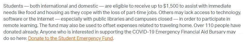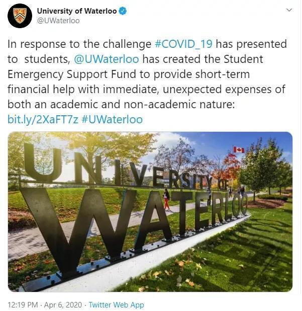 滑铁卢大学成立了学生紧急助学金项目及特别网页,以帮助受此次疫情影响的学生,学生申请紧急救助金的细节还没有颁布,但对本地学生和留学生都开放。