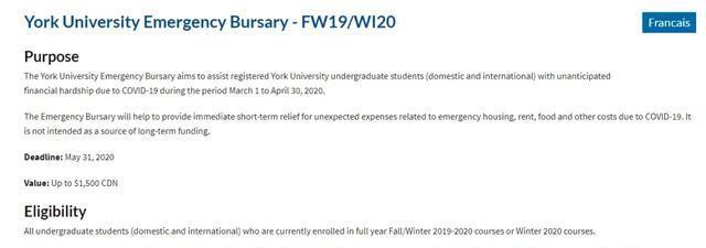 约克大学的紧急救助金仅对本科生开放,个人能获得的最高金额为$1500, 申请截止日期是5月31日。